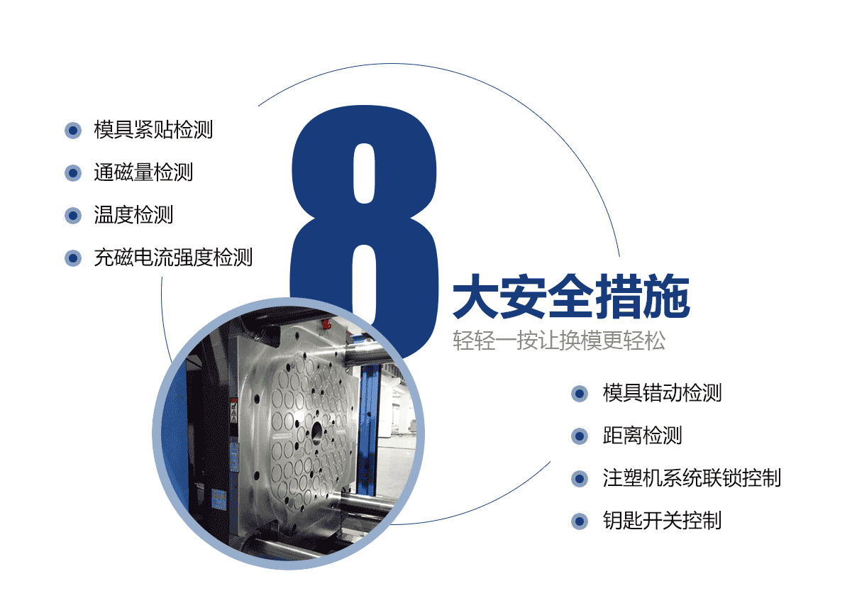 電永磁磁力模板只需一名操作員,無(wú)需其他工具,就可以在距注塑機(jī)安全距離的磁力系統(tǒng)上執(zhí)行操作。 大大降低人工成本和勞動(dòng)強(qiáng)度。